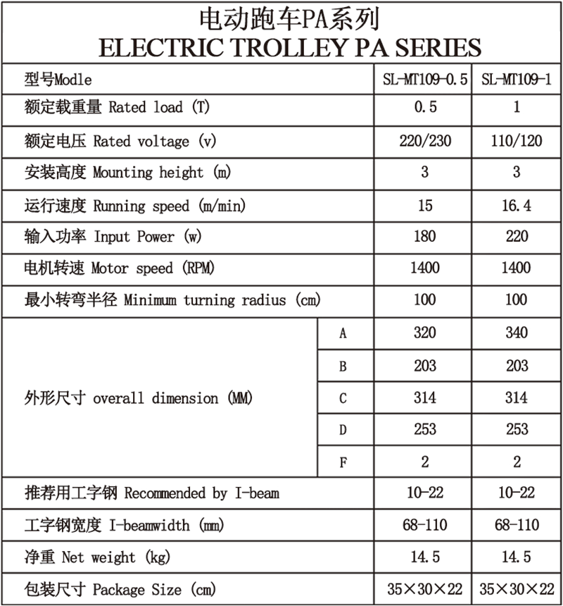 可与PA系列微型电动葫芦、手拉葫芦、手扳葫芦配合使用。 转弯半径小、过弯平稳。 适用于80-110宽度的工字钢。 优质碳钢正齿轮,确保跑车平稳运行。 高效率的终身免润滑滚珠轴承。